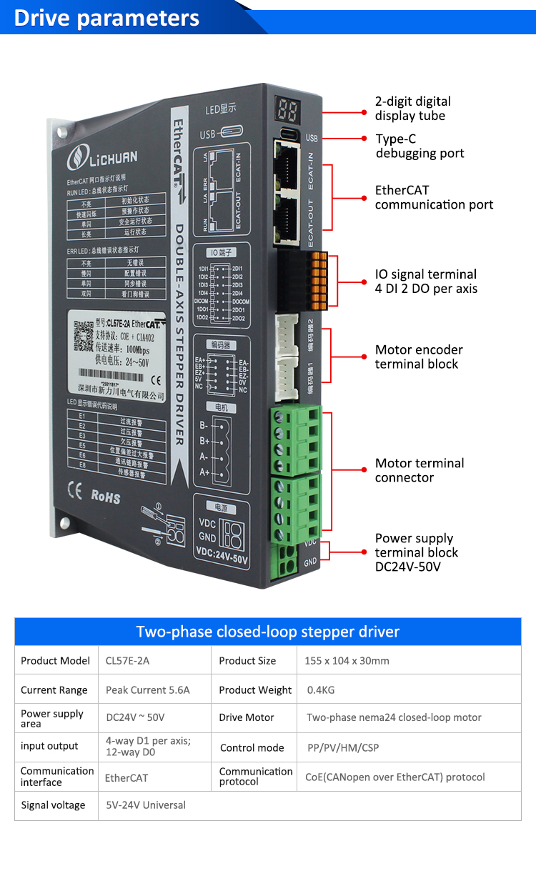 EtherCAT 2 เฟส Nema24 4 แกน DC Closed Loop Stepper Motor ชุดไดร์เวอร์ผลิตภัณฑ์ใหม่ EtherCAT 2 เฟส Nema24 ชุดไดรเวอร์สเต็ปเปอร์มอเตอร์แบบ Closed Loop DC 2 แกนผลิตในจีนที่มี CE/ROHS จาก LICHUAN® โรงงานของเราเป็นผู้ผลิตชุดไดรเวอร์มอเตอร์สเต็ปมอเตอร์แบบวงปิด EtherCAT 2Phase Nema24 2 แกน DC ที่มีชื่อเสียงและซัพพลายเออร์ในประเทศจีน ผลิตภัณฑ์ของเรามีคุณภาพสูง/ทนทาน/มีเสถียรภาพและราคาถูก และเราให้บริการที่กำหนดเอง