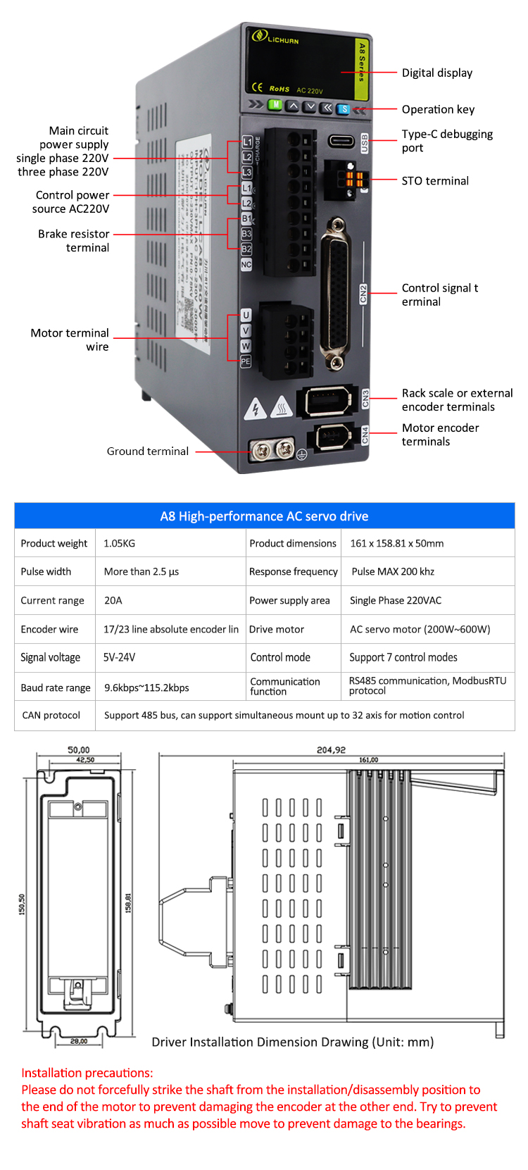 ซีรี่ส์นี้เป็นไดรฟ์เซอร์โว AC ประสิทธิภาพสูงพร้อมฟังก์ชันปิดแรงบิดเพื่อความปลอดภัย STO (Safe Torque Off) ในตัว ซึ่งเป็นไปตามมาตรฐานความปลอดภัย IEC 61800-5-2 และสามารถปิดเครื่องได้อย่างปลอดภัยในกรณีฉุกเฉิน ระบบรองรับโหมดการควบคุมวงปิดเต็มรูปแบบ และได้รับความแม่นยำของตำแหน่ง ± หนึ่งพัลส์ ผ่านการป้อนกลับของตัวเข้ารหัสความละเอียดสูง ซึ่งเข้ากันได้กับมอเตอร์หมุนและสถานการณ์การใช้งานมอเตอร์เชิงเส้น มีอินเทอร์เฟซการดีบัก Type-C รองรับการกำหนดค่าพารามิเตอร์แบบเรียลไทม์ และมีอินเทอร์เฟซการสื่อสาร RS485 ในตัว (โปรโตคอล Modbus RTU) และอัตราการรับส่งข้อมูลสามารถปรับได้ตั้งแต่ 9.6kbps ~ 115.2kbps ใช้อัลกอริธึมการควบคุมการวางแนวสนามแม่เหล็ก (FOC) ซึ่งเหมาะสำหรับโอกาสการตอบสนองแบบไดนามิกสูง เช่น CNC ที่มีความแม่นยำและอุปกรณ์เซมิคอนดักเตอร์